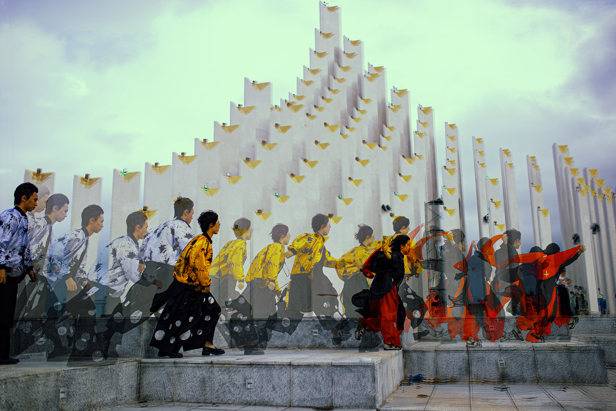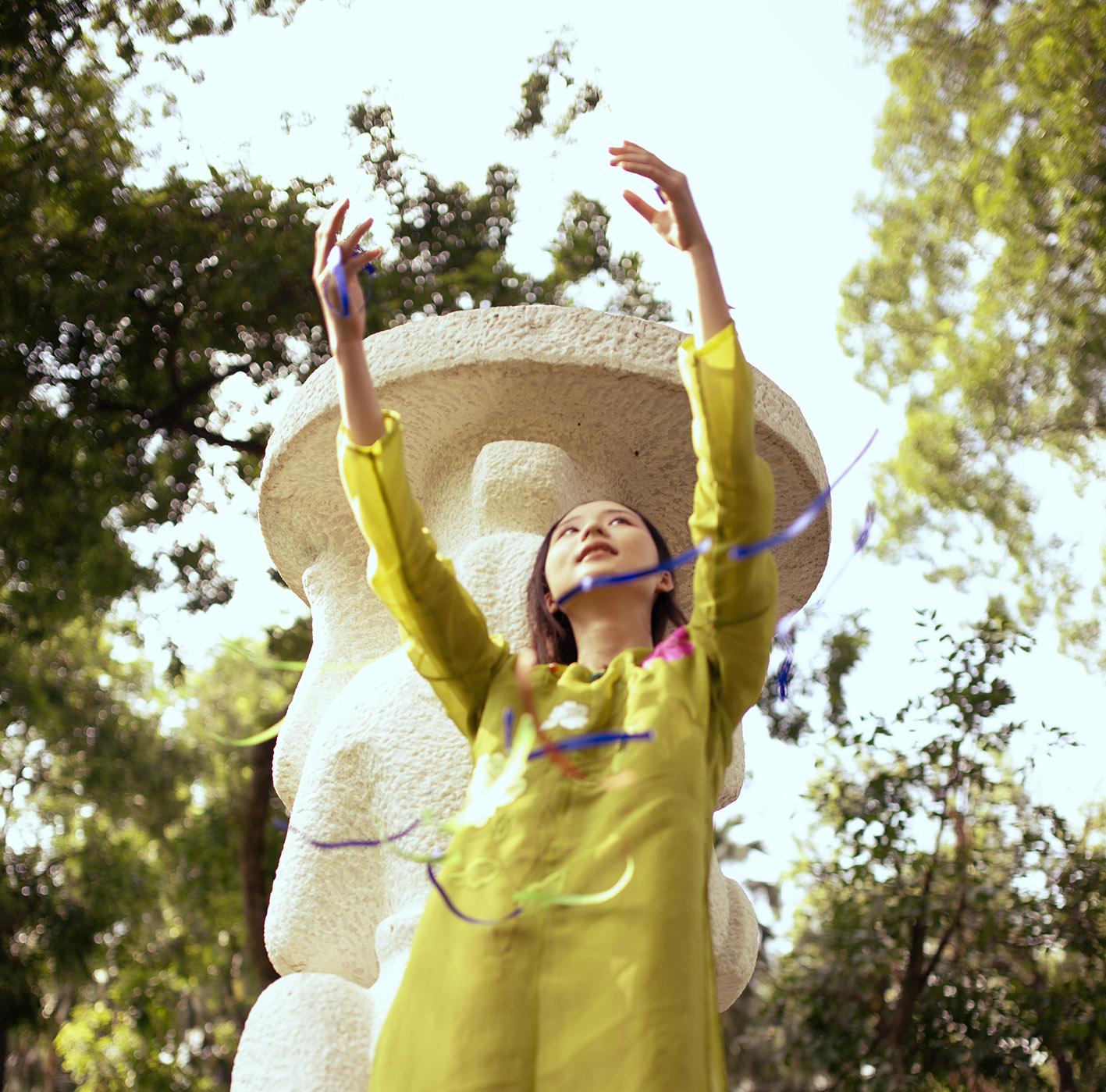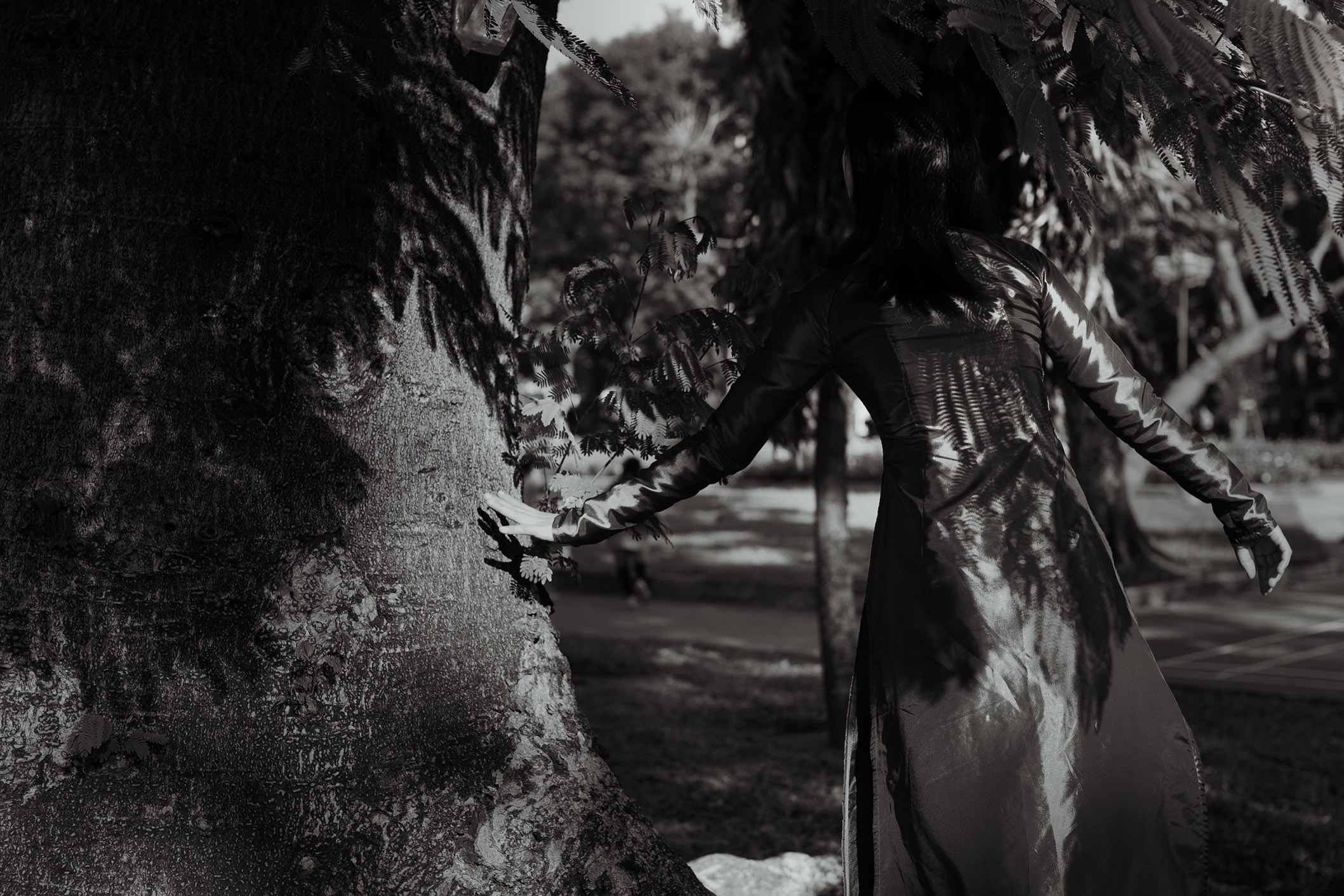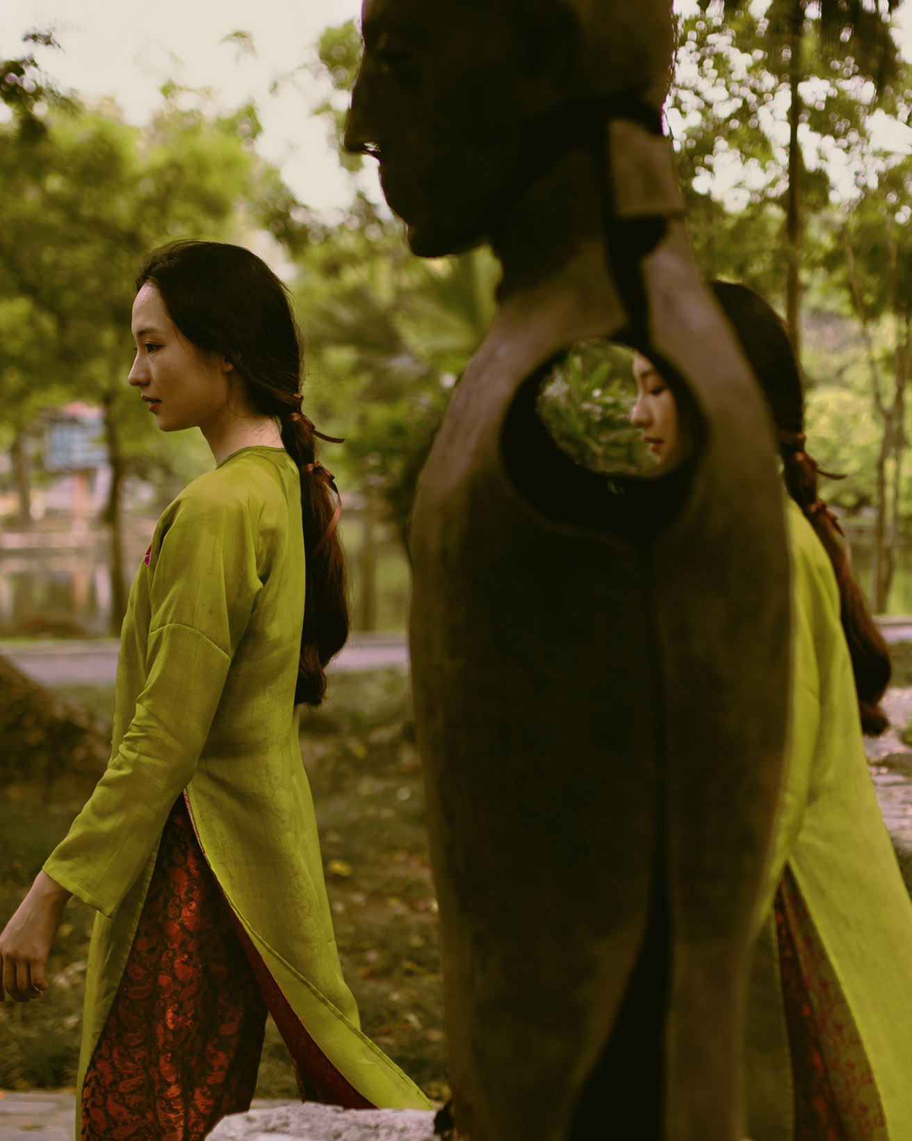This is not only subject to the model but also objective due to natural factors such as the altitude of the area, the density of trees in the area, the temperature of the area, and the construction density of the area. Natural factors and artificial factors directly affect human life and thereby contribute to forming the overall energy of that space. Choosing the Ao Dai is an experiment because it is an attention-grabbing outfit, but still very close to the life of Vietnamese people, as an interesting interactive test.