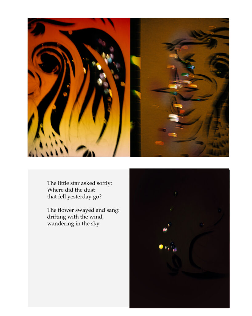 – For Geno Korner: (collaboration Dremachi Space) I want to use photography to pay tribute to the book projects that illustrate the philosophy of the connection between humans and their living environment and nature, as well as a tribute to Mother Earth for the impact that each of our actions has on the sensitivity of nature. This process uses the camera as a machine/device to express the honor of nature and combines the manual collage techniques from human hands. The link between science (creating the camera), humans (craft, handmade, creating the drawings, surfaces, meanings), and nature (the beauty of nature).